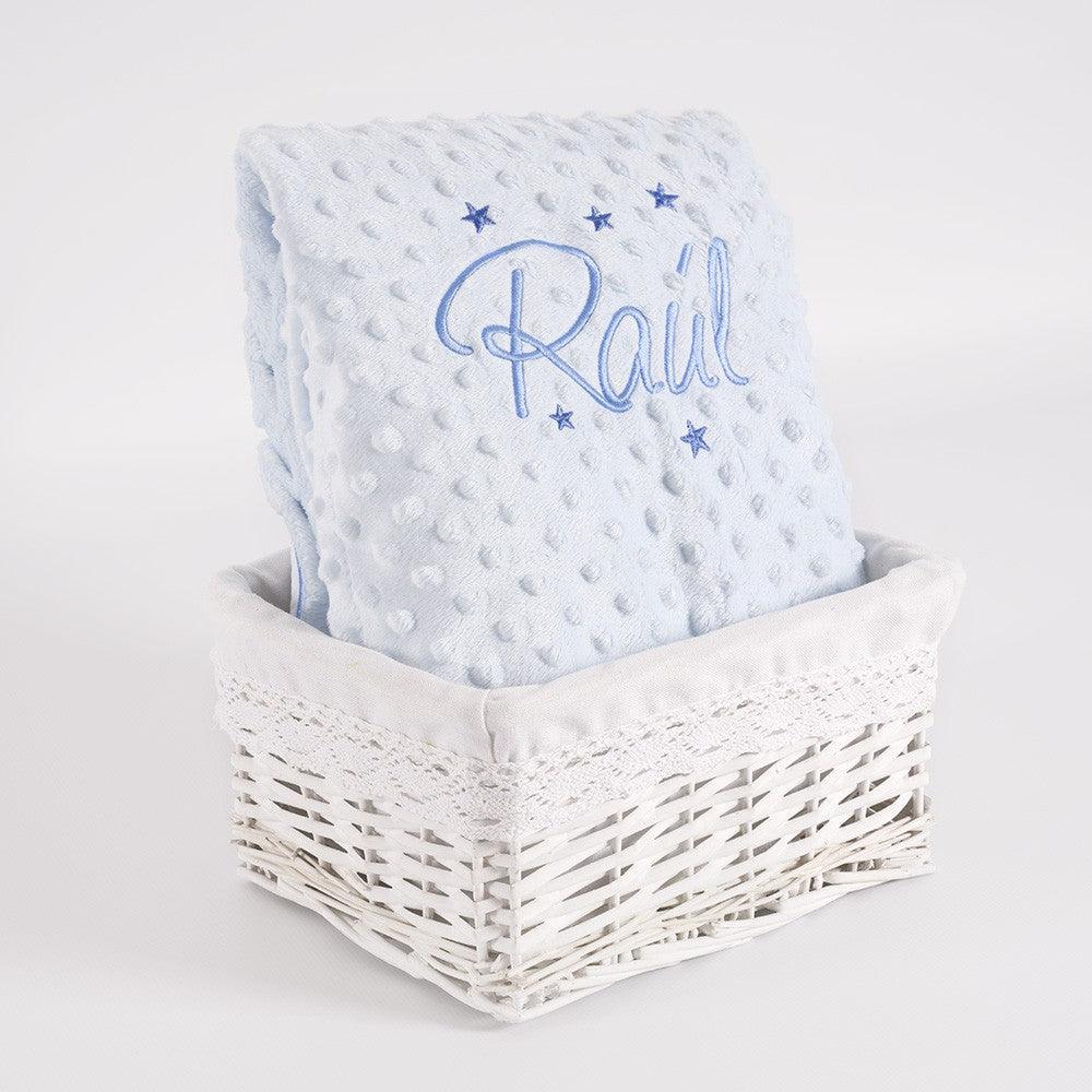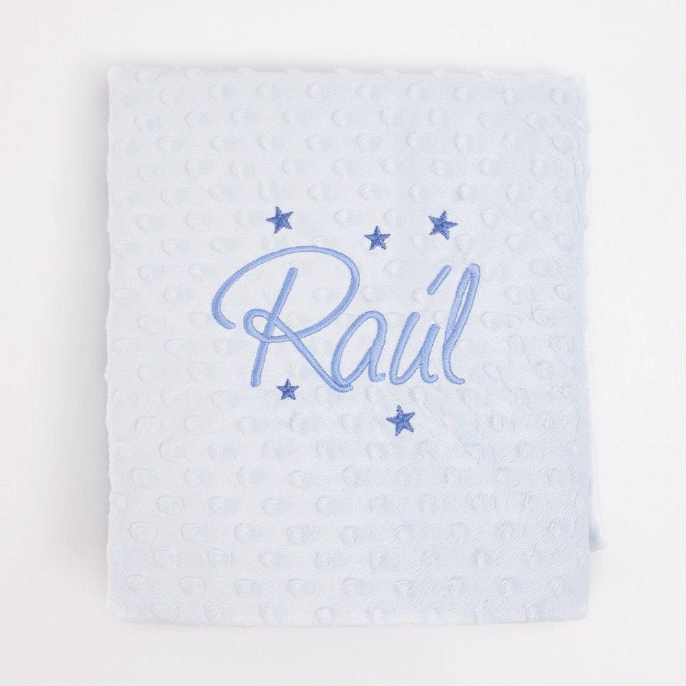 Manta bebe personalizada con el nombre del bebé bordado y dos estrellas.
