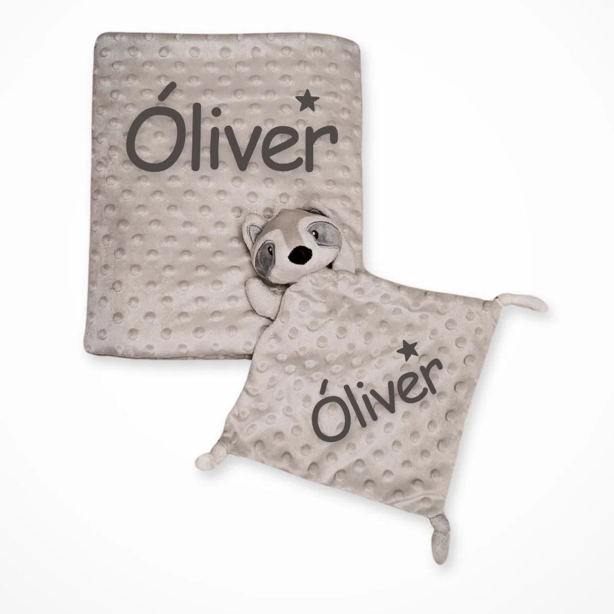 Manta y dou dou color gris. Tú eliges el tipo de letra y el color de la letra bordada.
