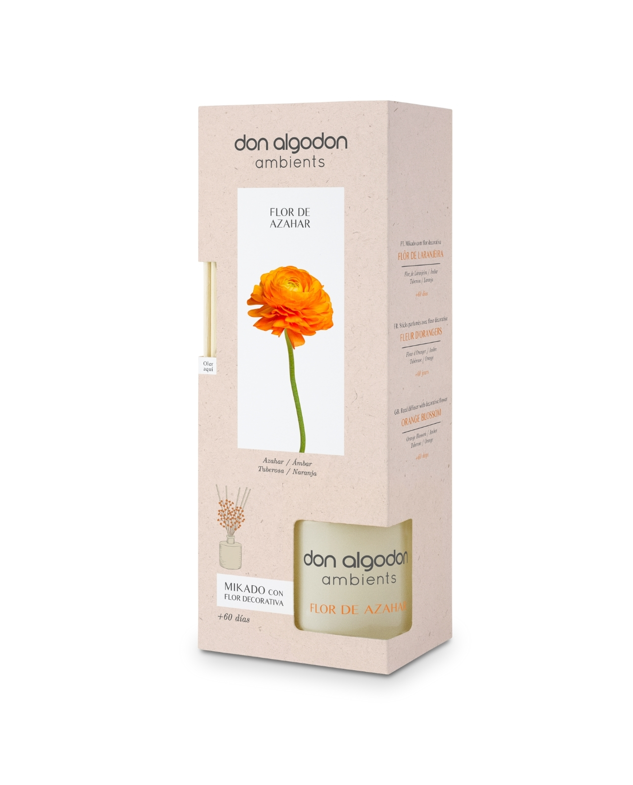 Ambientador Mikado Flor de Azahar Don Algodón Ambients Edición Floral con cañas de ratán. Perfumador Mikado de 60 ml con extractos naturales y hasta 60 días de duración.