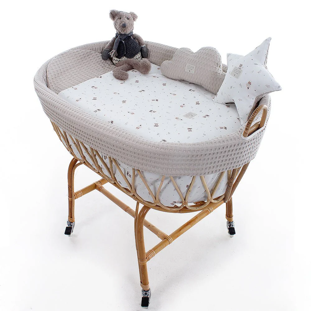 Minicuna completa con estructura de ratán hecha a mano en España. Con vestiduras de la prestigiosa marca española Uzturre.