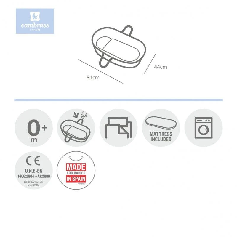 Moisés bebés de palma con patas incluidas de la prestigiosa marca española Cambrass. Algodón 100%