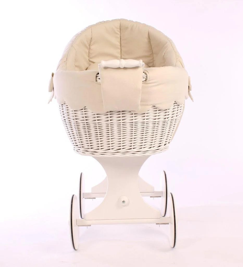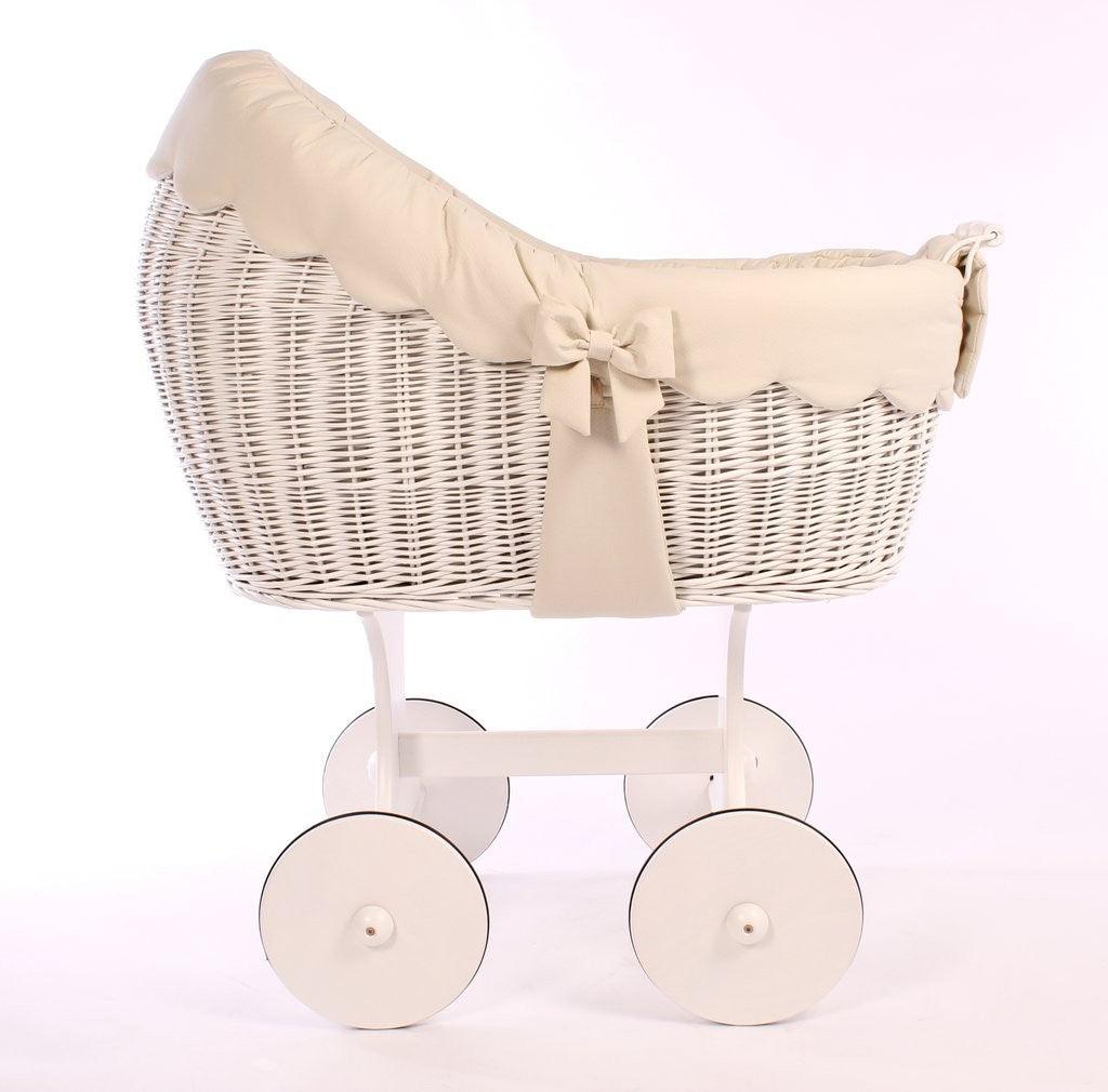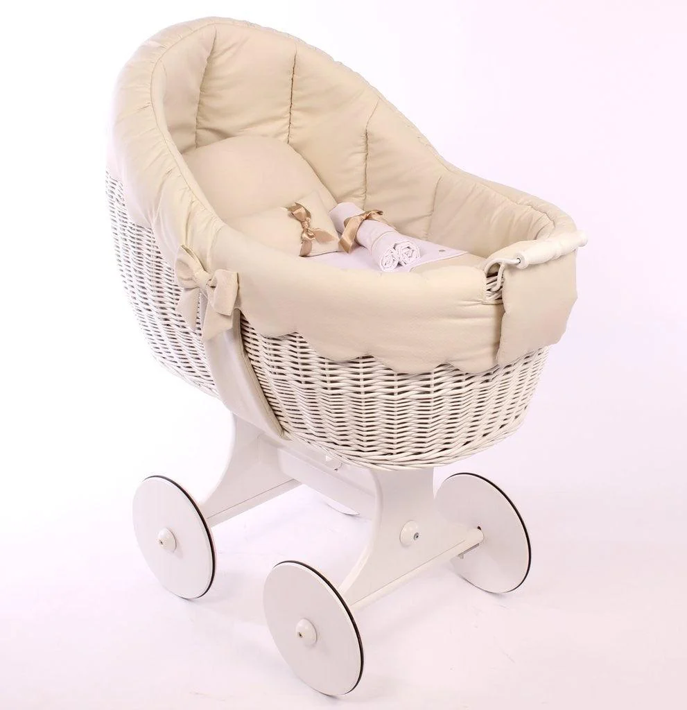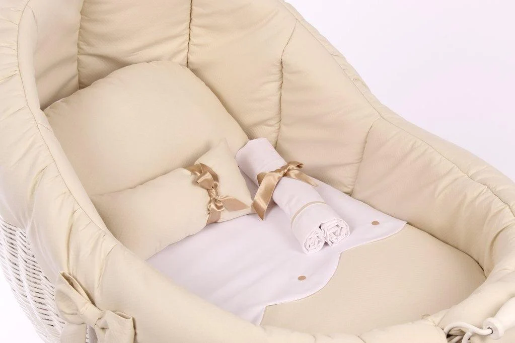 Una obra de artesanía; este moisés de mimbre hecho totalmente a mano. Desde la estructura a las vestiduras todo es una obra de arte que usará tu bebé y pasará de generación en generación.