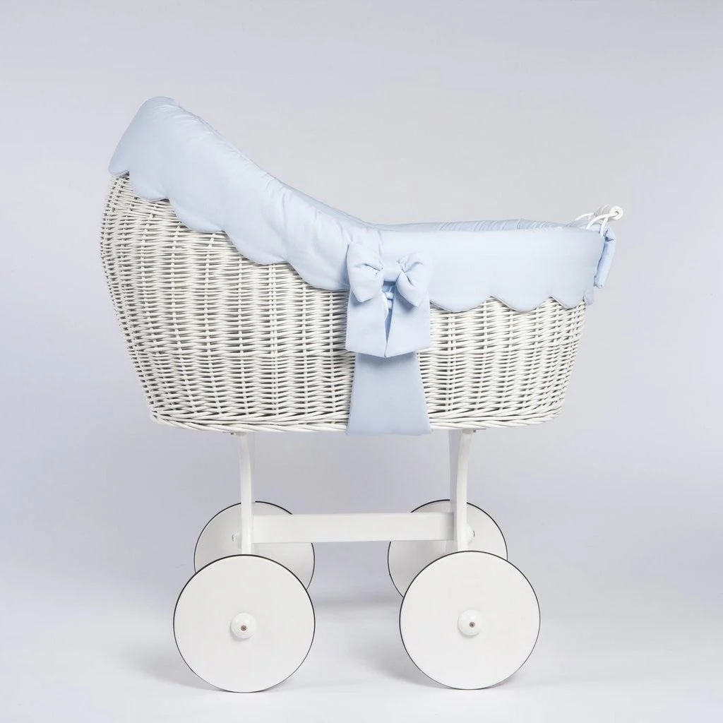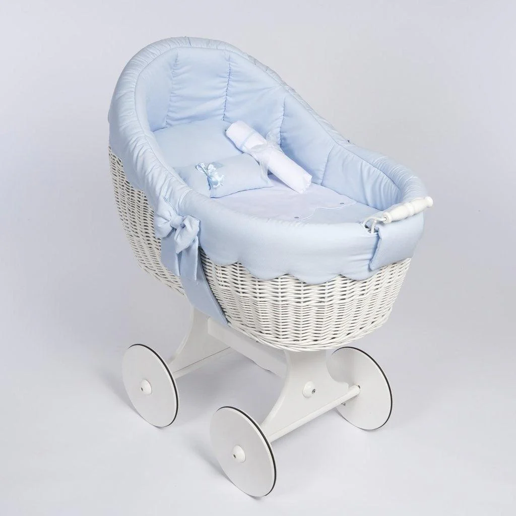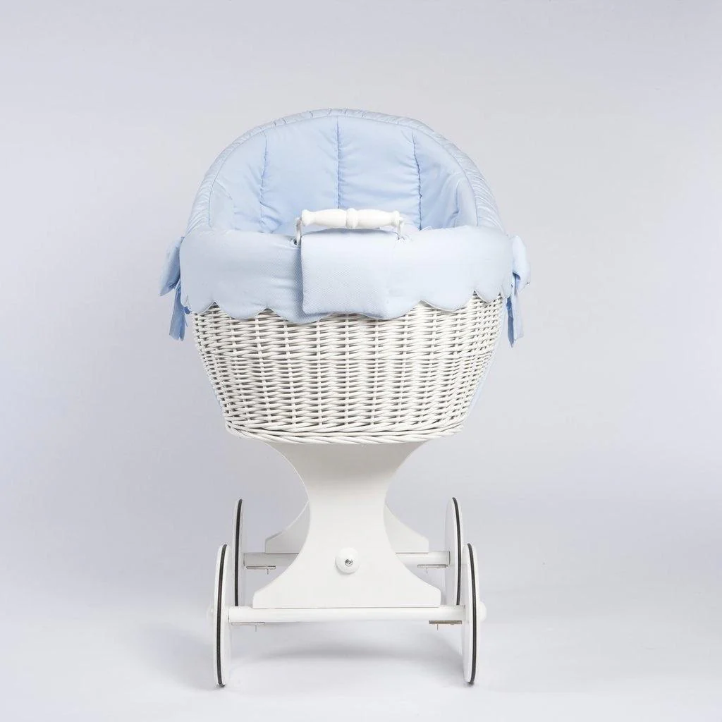 Una obra de artesanía; este moisés de mimbre hecho totalmente a mano. Desde la estructura a las vestiduras todo es una obra de arte que usará tu bebé y pasará de generación en generación.