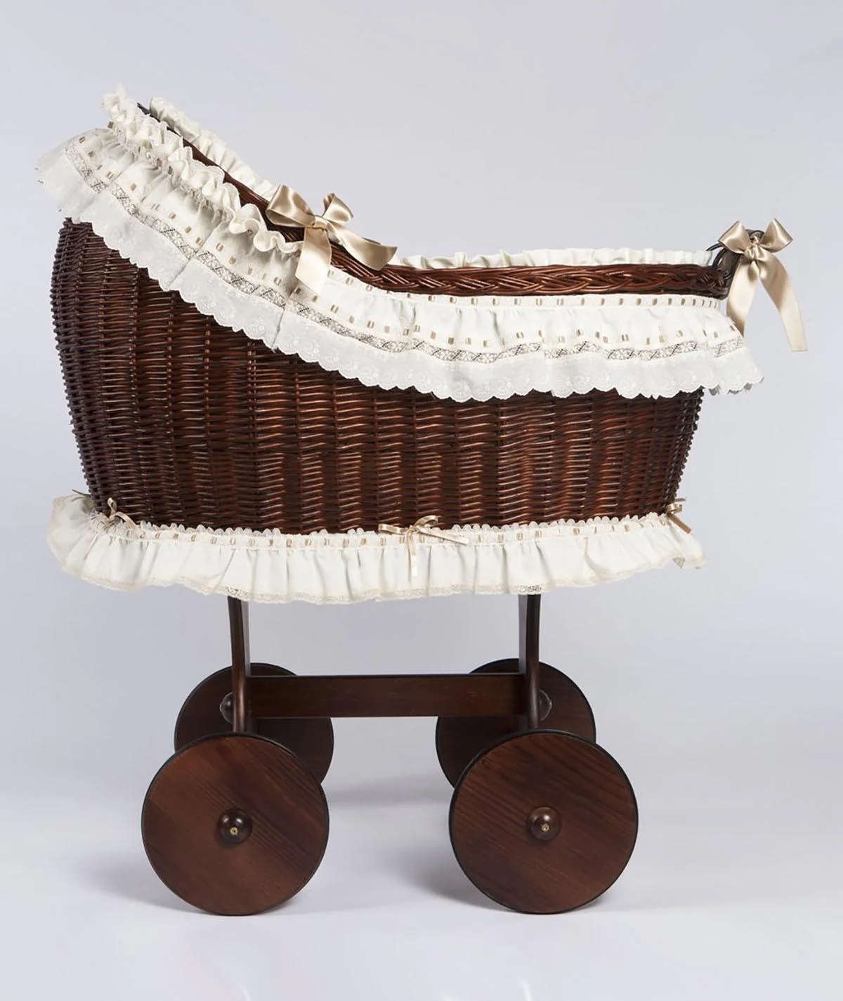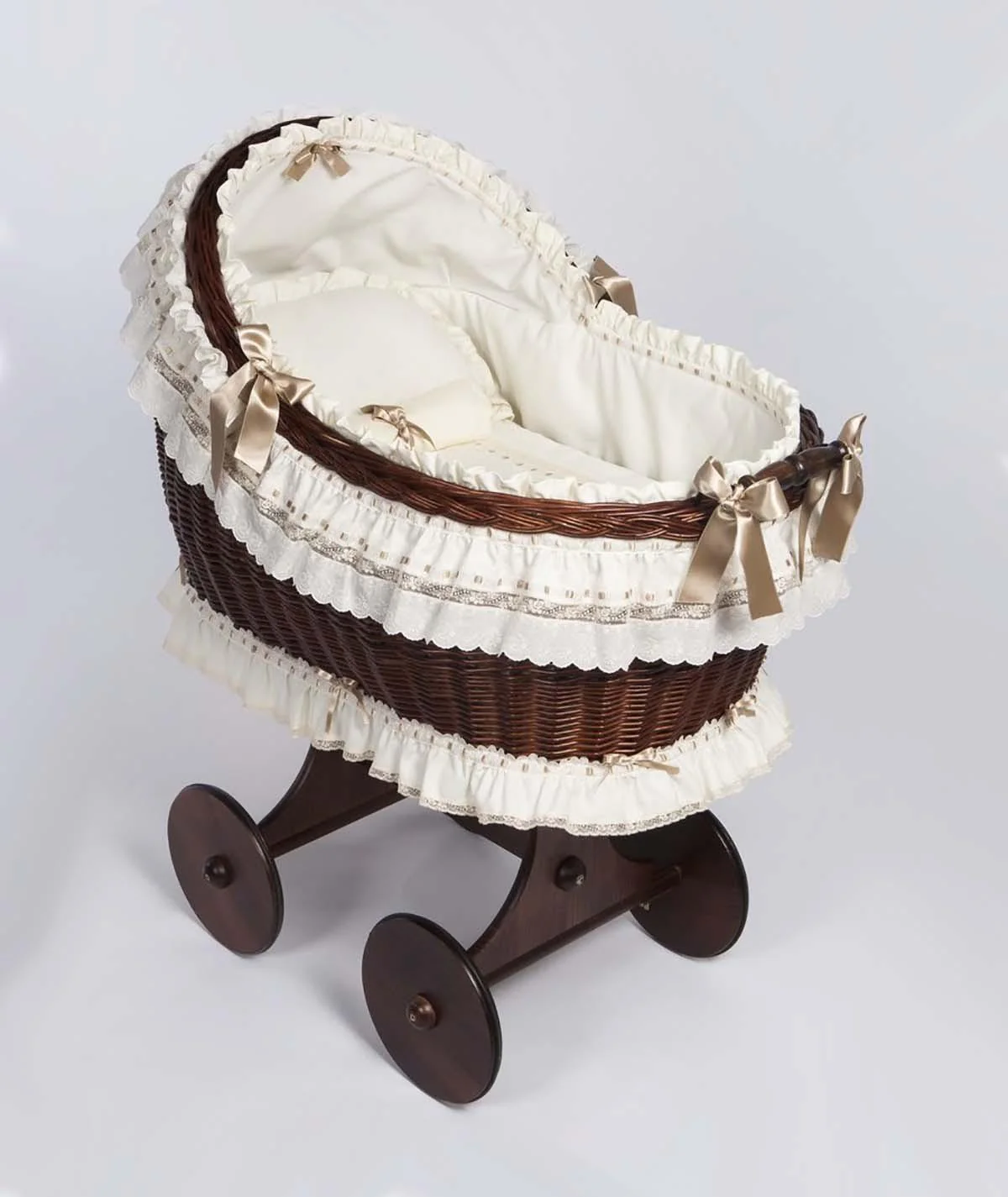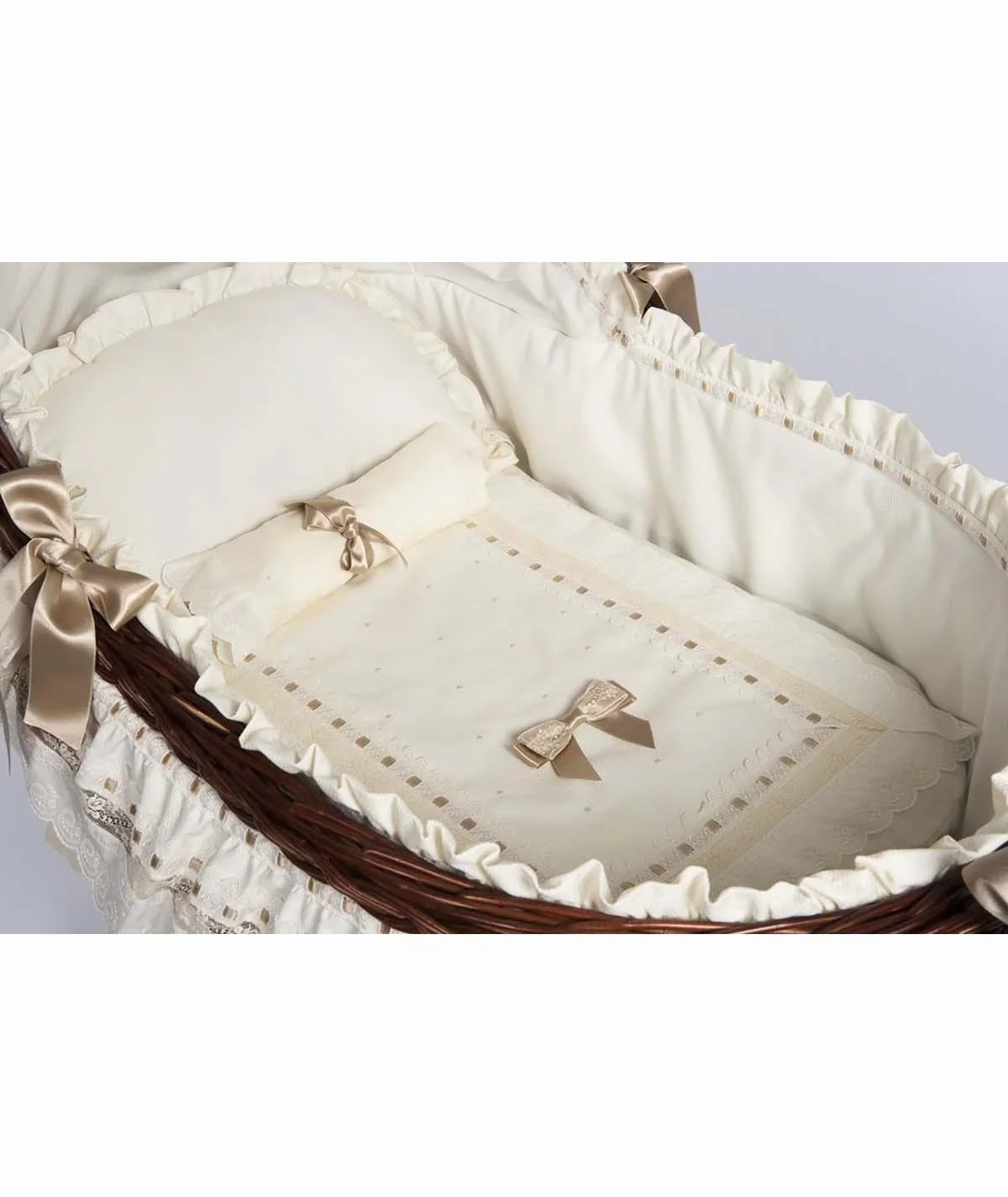 Una obra de artesanía; este moisés de mimbre hecho totalmente a mano. Desde la estructura a las vestiduras todo es una obra de arte que usará tu bebé y pasará de generación en generación.