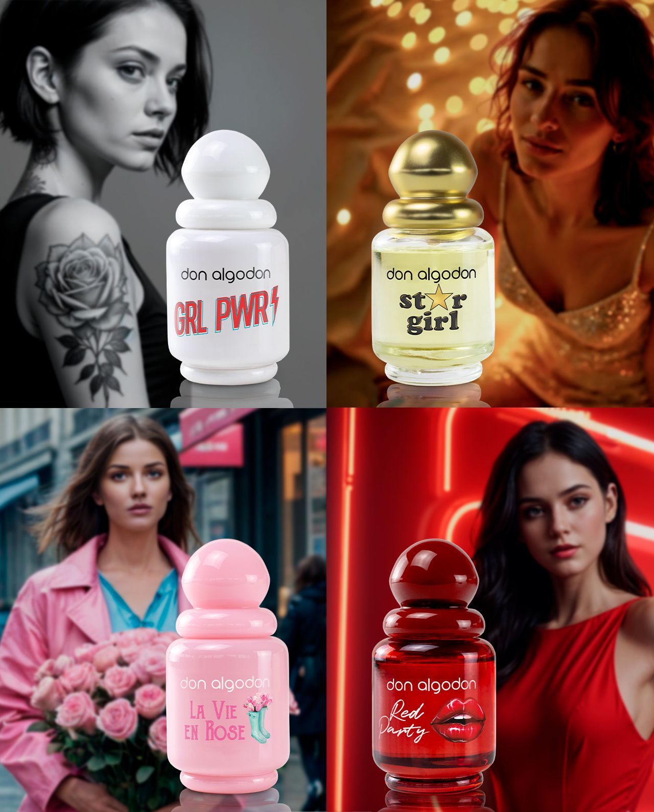 El Pack de 4 Colonias de Mujer de Don Algodón te ofrece una selección de fragancias irresistibles y versátiles, ideales para cada momento del día.