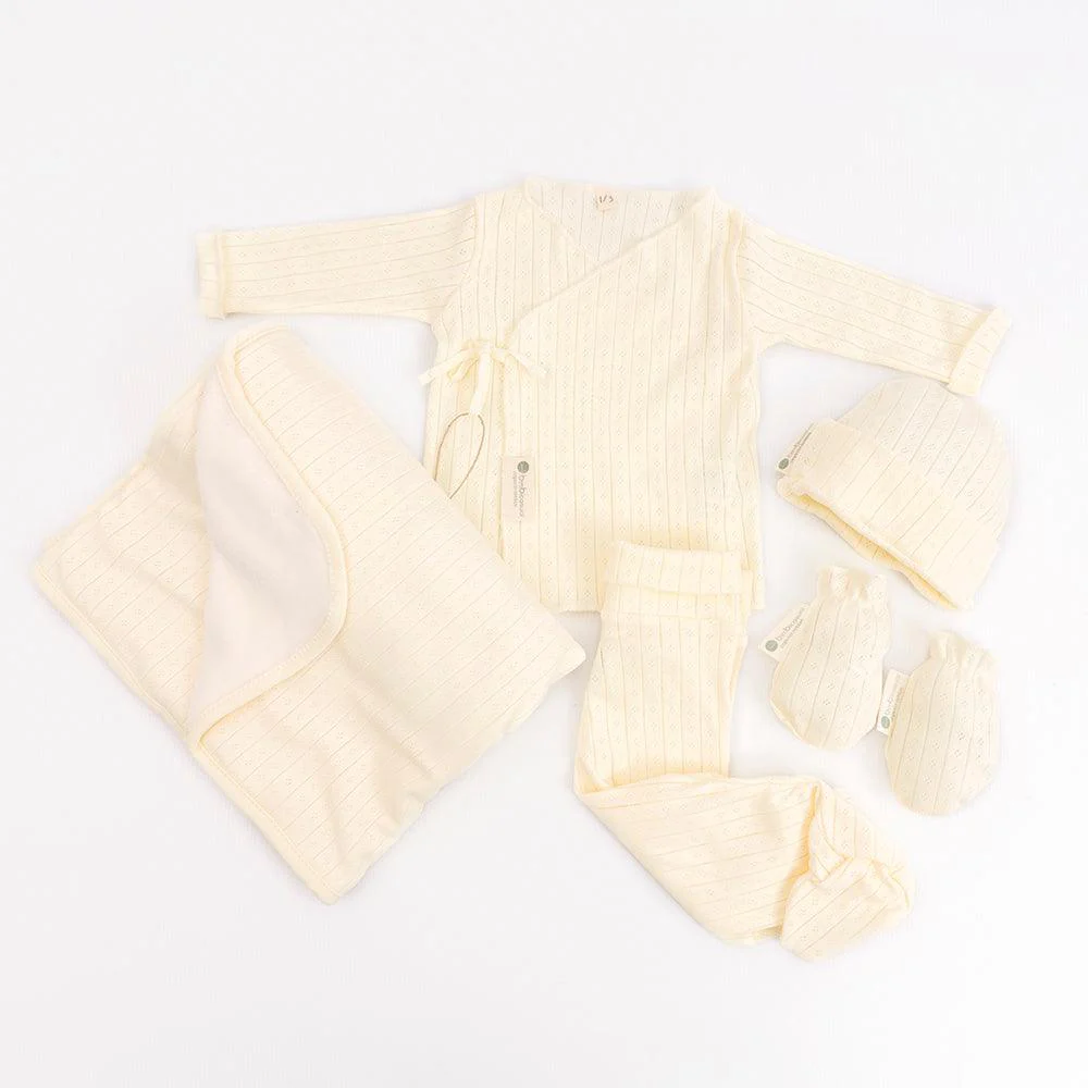 Pack de primera puesta calado de algodón 100% orgánico. Jubón + polaina + gorrito + manoplas + Arrullo.