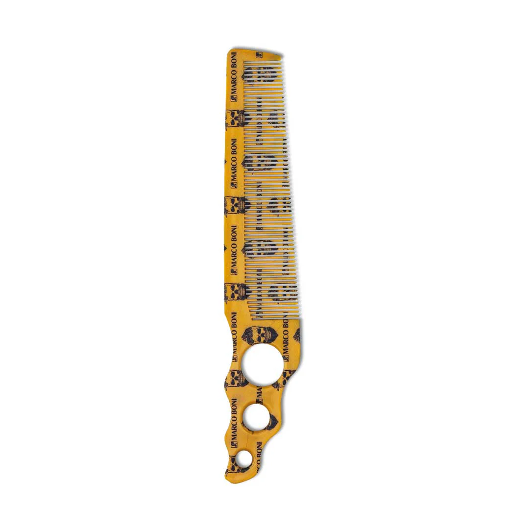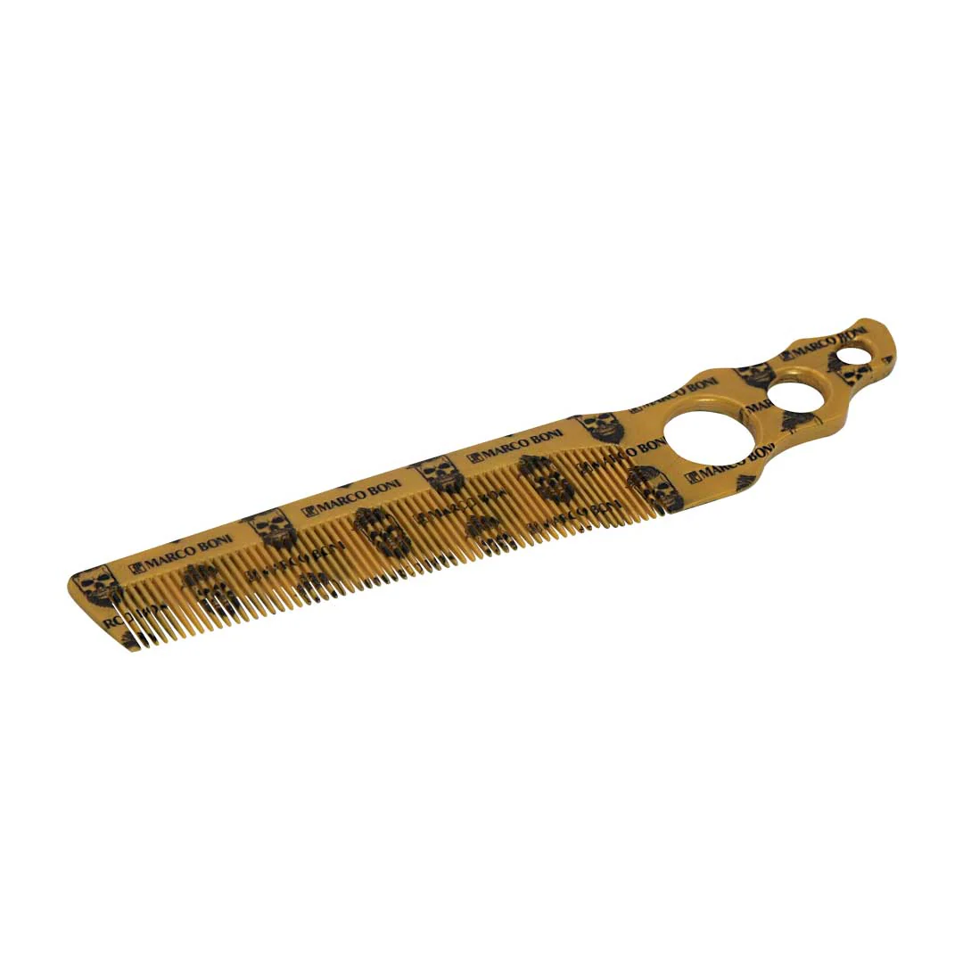 El Peine Calavera Marco Boni ofrece control y precisión en cortes y peinados gracias a sus dientes finos y resistentes y a su apoyo anatómico para los dedos, que mejora el agarre y la estabilidad en cada pasada.
