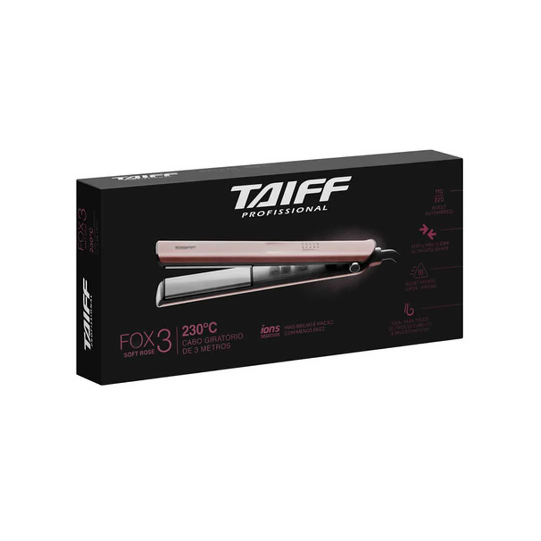 Plancha Taiff Fox 3 Soft Rose (bivolt automático) con iones negativos y calentamiento cerámico. 5 temperaturas de 150–230 °C, calienta en ~60 segundos, cable giratorio de 3 m.