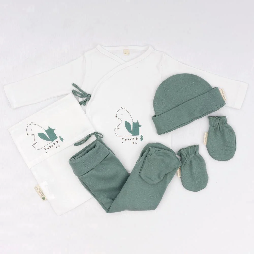 Pack de primera puesta de algodón 100% orgánico. Jubón + polaina + gorrito + manoplas + bolsa de muda.