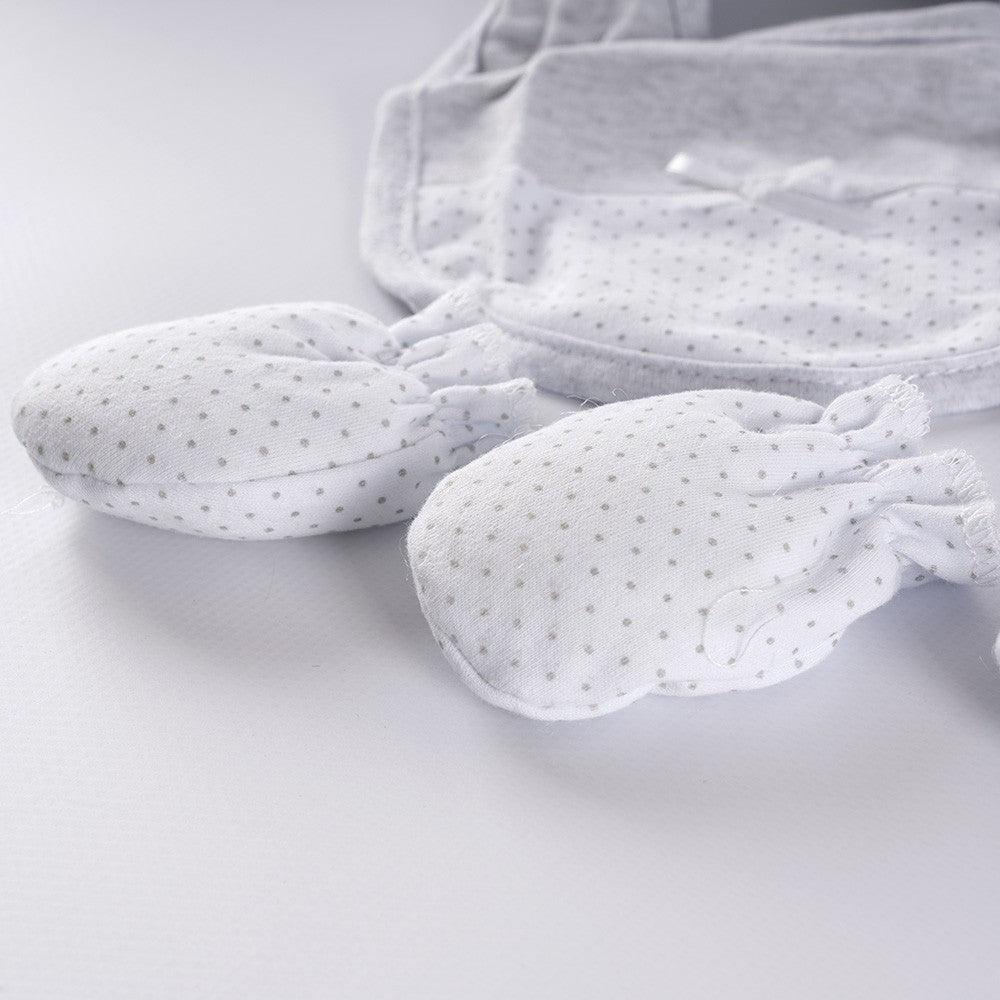 Talla única para recién nacido ideal para el paritorio y primeras mudas. El gorro es imprescindible porque los recién nacidos pierden gran parte del calor corporal por su cabeza. Las manoplas son necesarias para evitar los arañazos. Conjunto abierto por detrás para vestir y cambiar al bebé con comodidad.