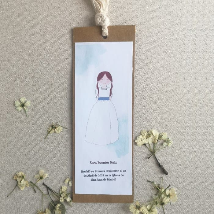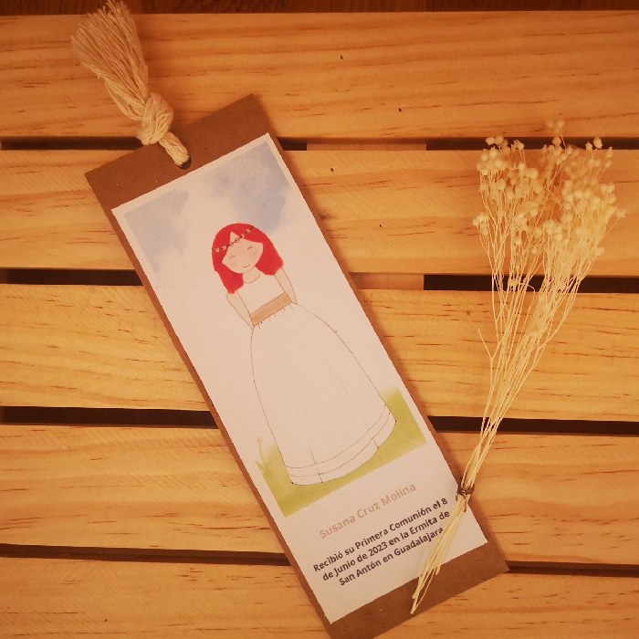 Recordatorio marcapáginas diseñado y dibujado de manera artesanal y posteriormente digitalizado. Impreso en papel de alta calidad de 240 g/m. Medidas 6cm x 16,5cm Se presentan con cartulina Kraft trasera.