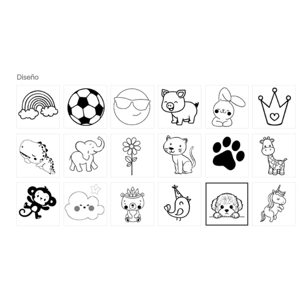 | DISEÑO | Arco Iris, Balón, Cerdito, Conejo, Corona, Dino, Elefante, Flor, Gato, Girafa, Huella, Mono, Nube, Oso, Pajarito, Perro, Sol con gafas, Unicornio |