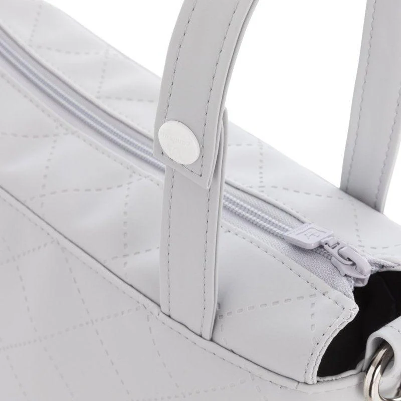 Bolso Panera de Cambrass con un sistema de dos asas para colgar en los carritos. Cierre con cremallera. Incluye asa larga para poder llevar colgado al hombro.