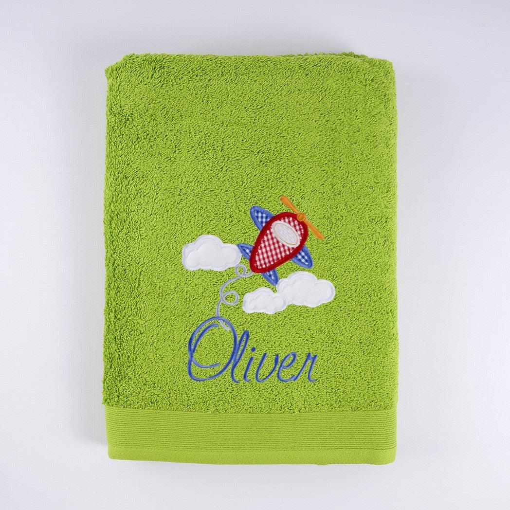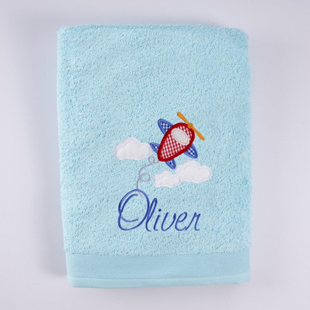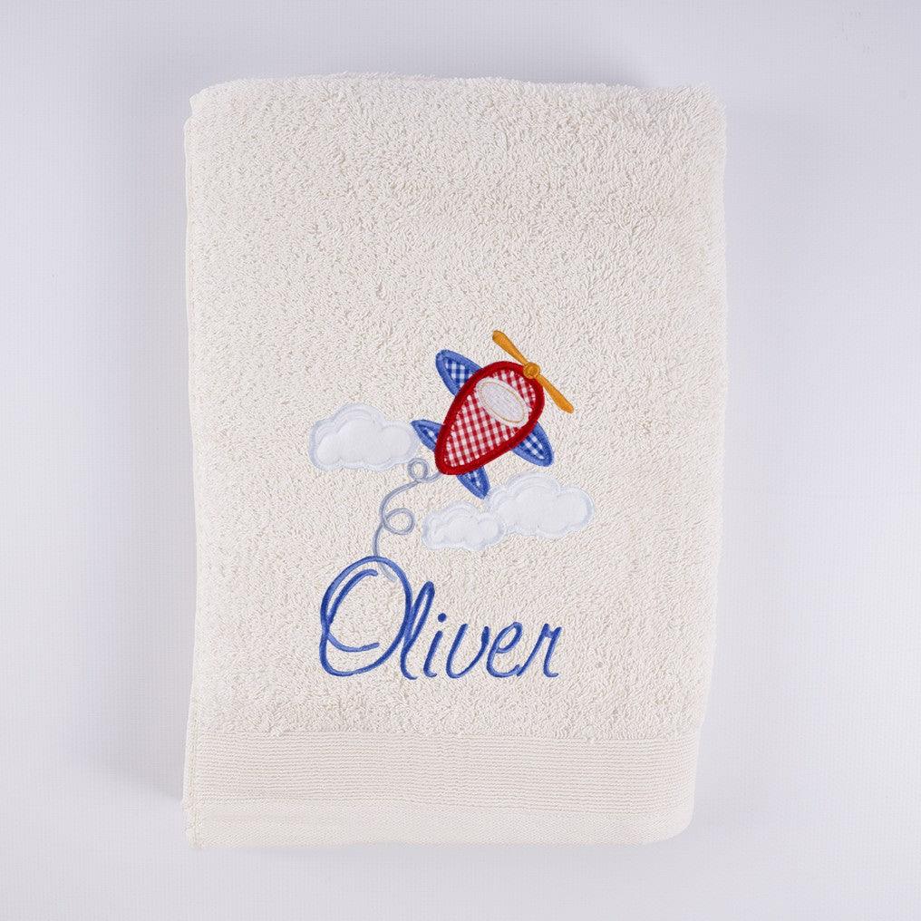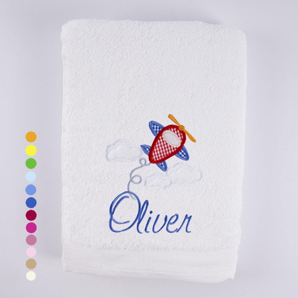 Una Toalla Personalizada bordada con el nombre y un aplique de tela.