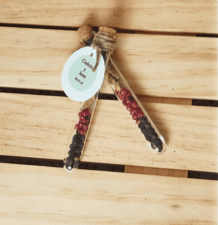 Tubo de cristal decorado que contiene cuatro especias para elaborar Gyn Tonic, cardamomo, pimienta negra, pimienta rosa y enebro. Con etiqueta personalizada para el evento. Un buen detalle para tus invitados al que se seguro sabrán sacar partido!