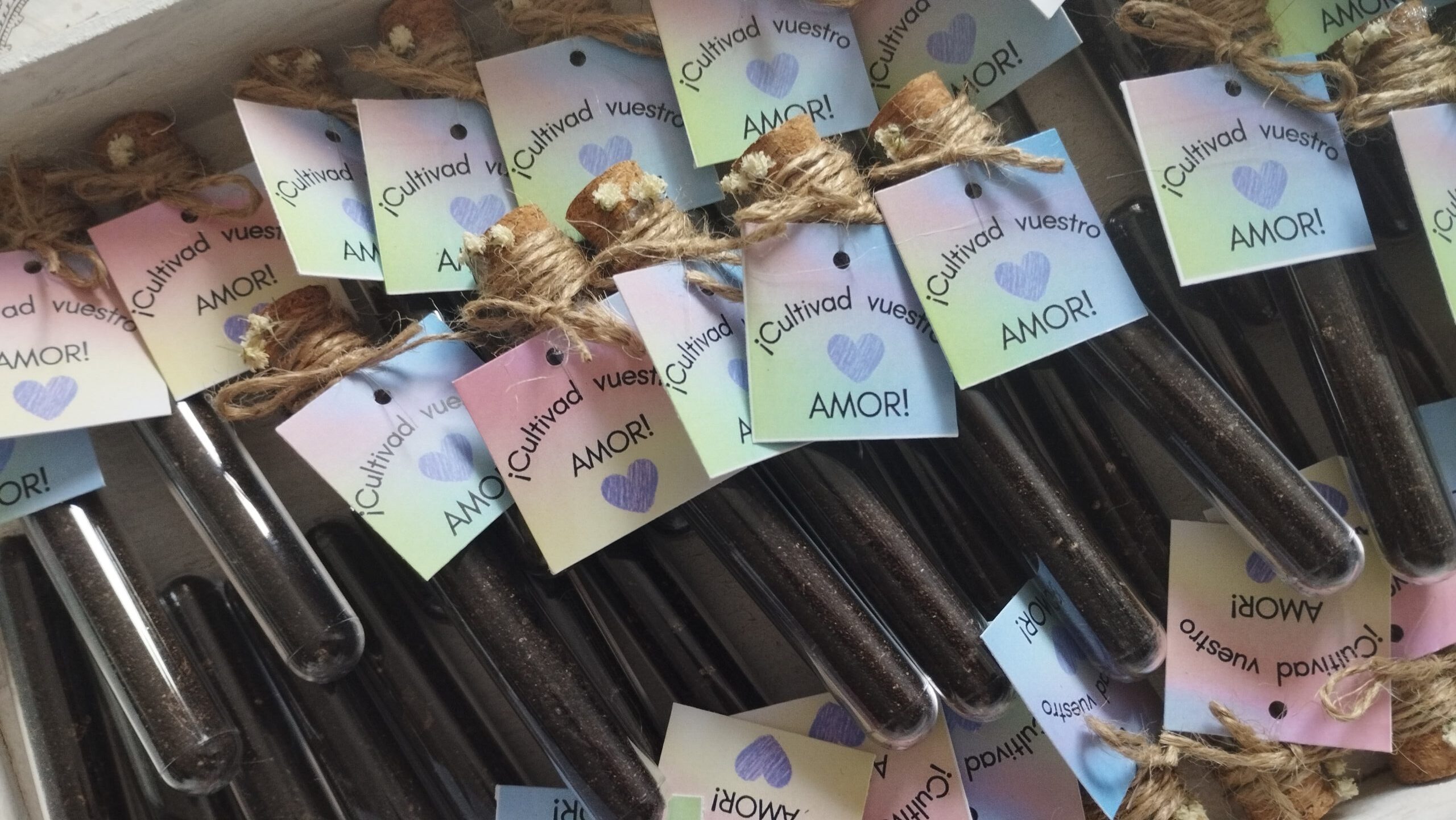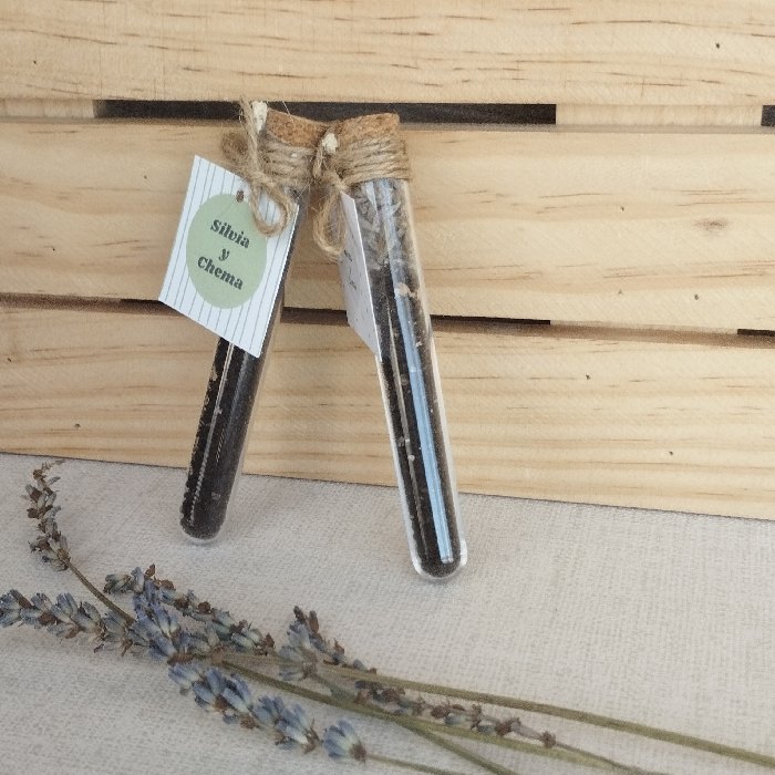 Original detalle para tus invitados. Tubo de ensayo decorado y relleno de preparado de compost y semillas de lavanda, listo para poner en maceta, regar y dejar que la naturaleza haga lo demás! Etiqueta personalizada del evento.