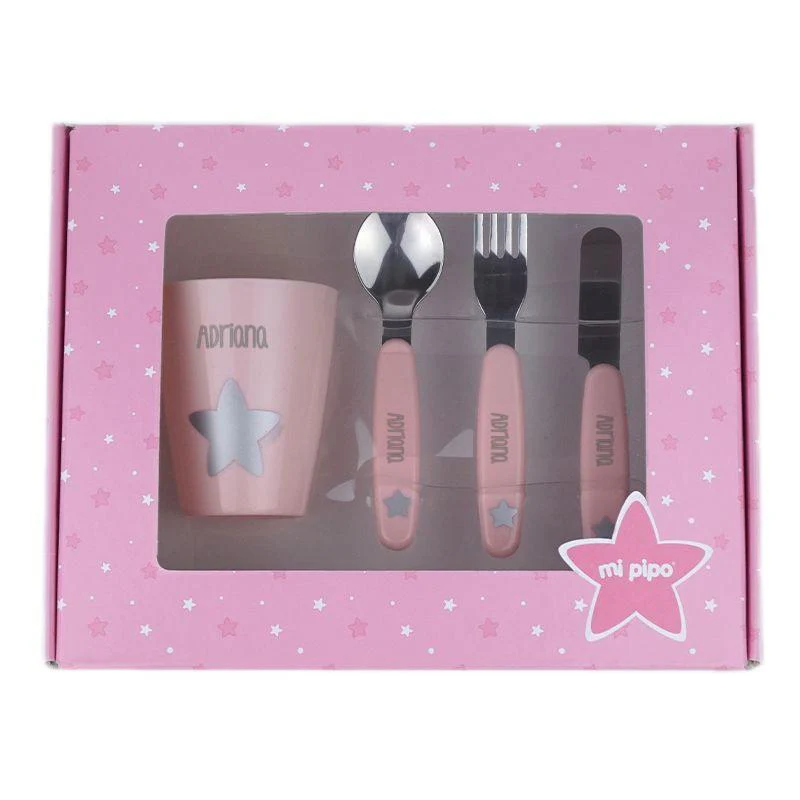Vajilla para bebé personalizada con cubiertos de acero y vaso.