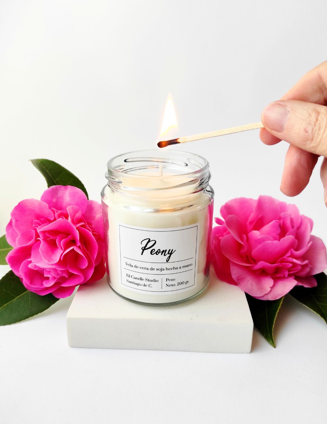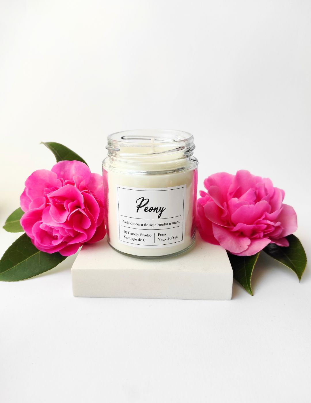 «description»: » Vela de soja con aroma floral a peonía. Suave, elegante y perfecta para crear espacios delicados y acogedores.»,