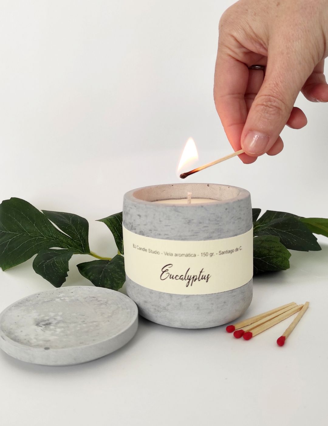 «description»: «Vela de soja en tarro de cemento con aroma a eucalipto. Un diseño minimalista y artesanal que aporta frescura y estilo a cualquier rincón de tu hogar.»,