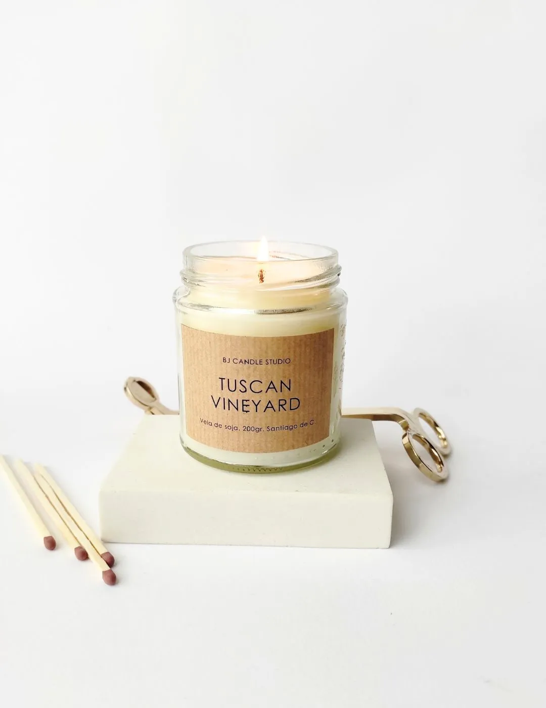 «description»: «La vela de soja Tuscan Vineyard, es una vela de fragancia afrutada, inspirada en la Toscana. Huele a un paseo entre viñedos al atardecer.»,