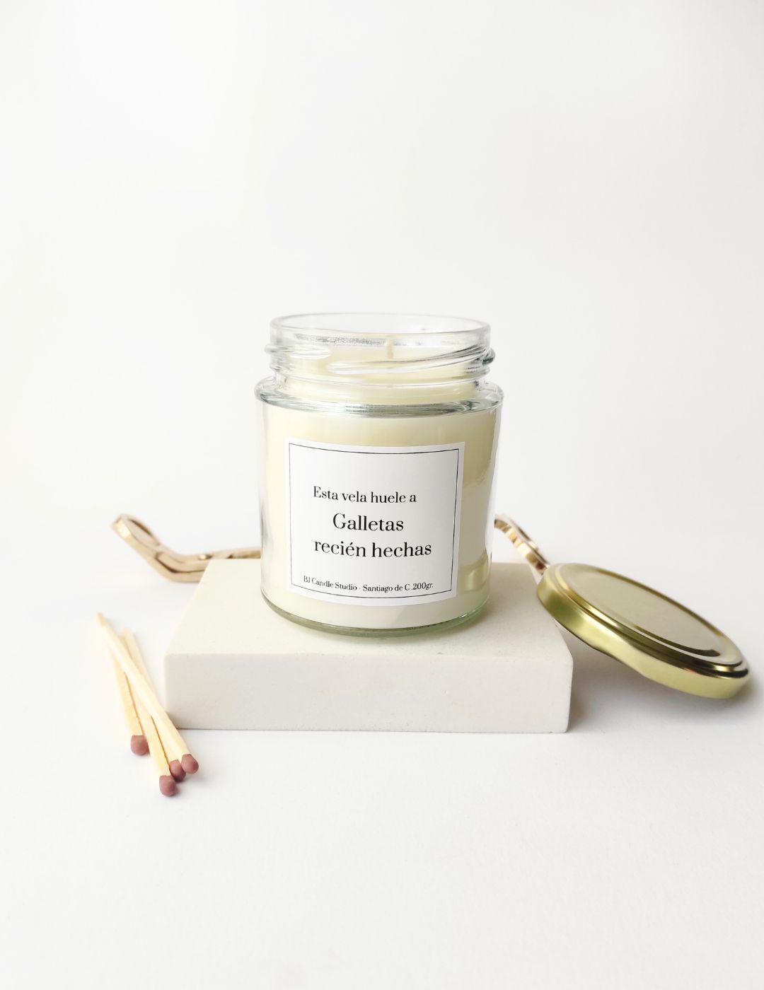 «description»: » Vela de cera de soja con aroma a galletas recién horneadas. Dulce, cálida y perfecta para crear un ambiente acogedor y reconfortante.»,