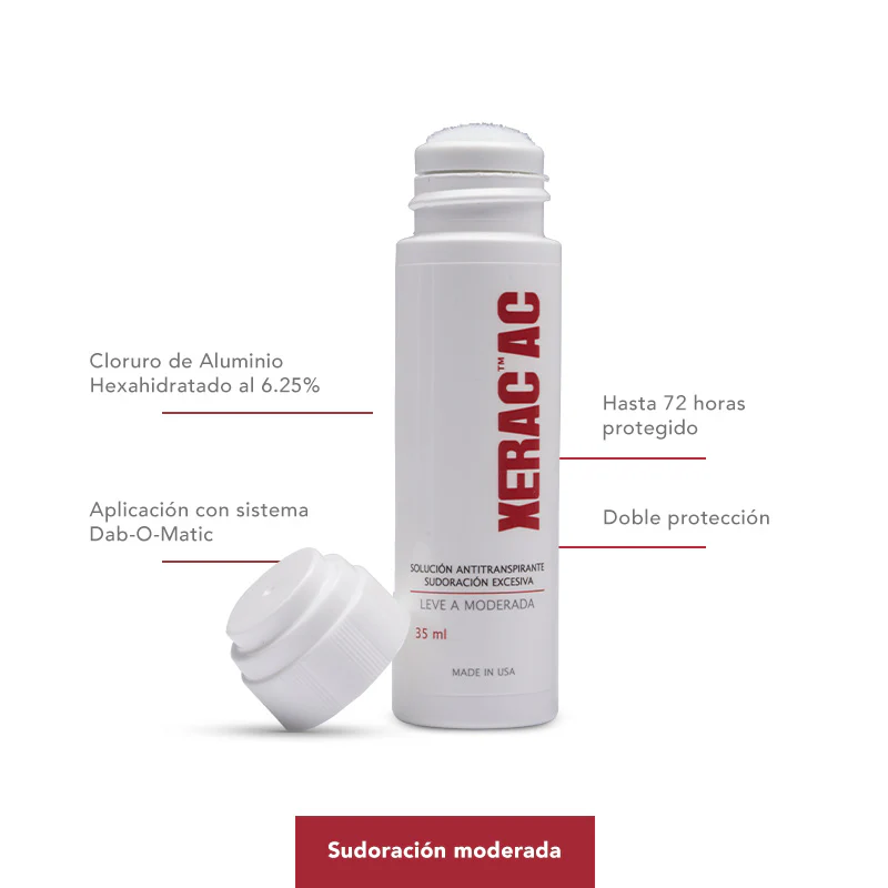 XERAC AC es la Solución Dermatológica Comprobada para el Control de la sudoración moderada a severa en axilas, manos, pies, u otra zona del cuerpo y rostro.